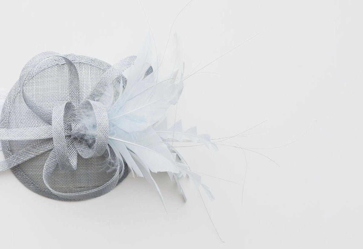 This sinamay fascinator is adorned with sinamay looping and large feather flower.  Attaches with a matching, satin headband for a secure and comfortable fit.