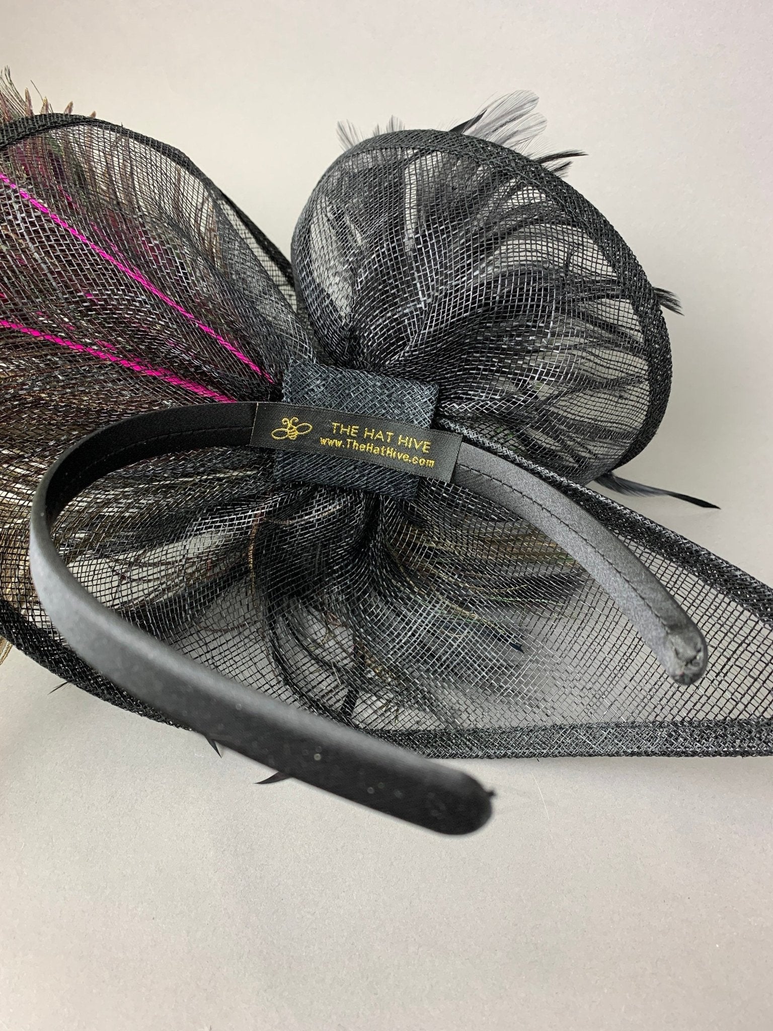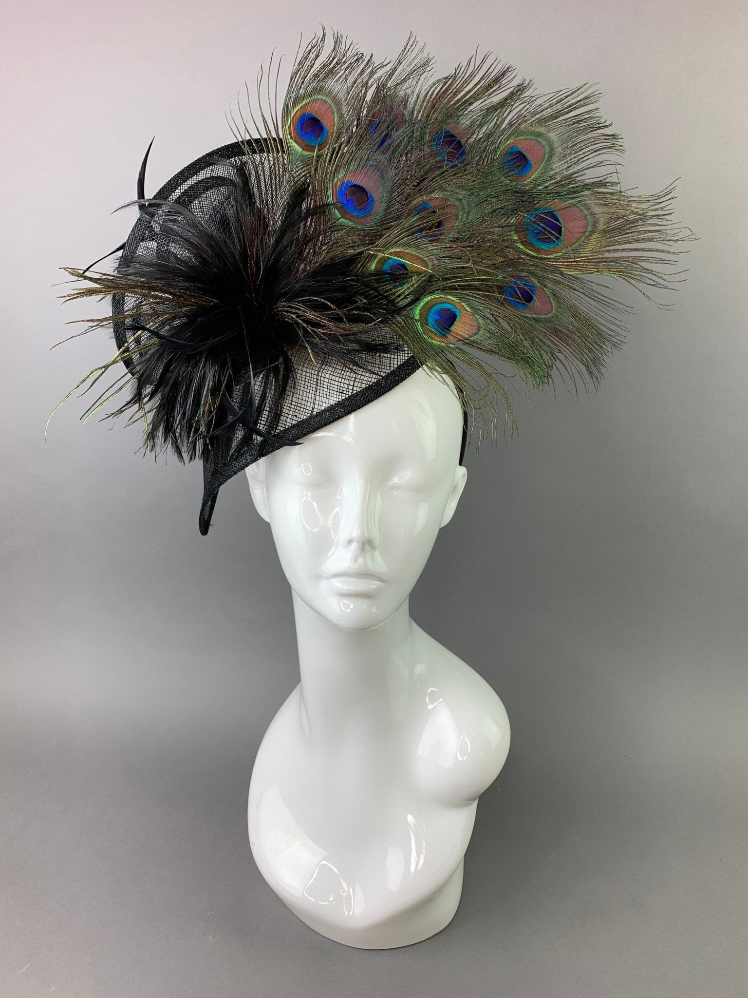 Fascinator in BLACK with peacock feathers. Fastens with a matching satin headband is perfect for the Kentucky Derby, Church Hat, shower, or any special occasion.