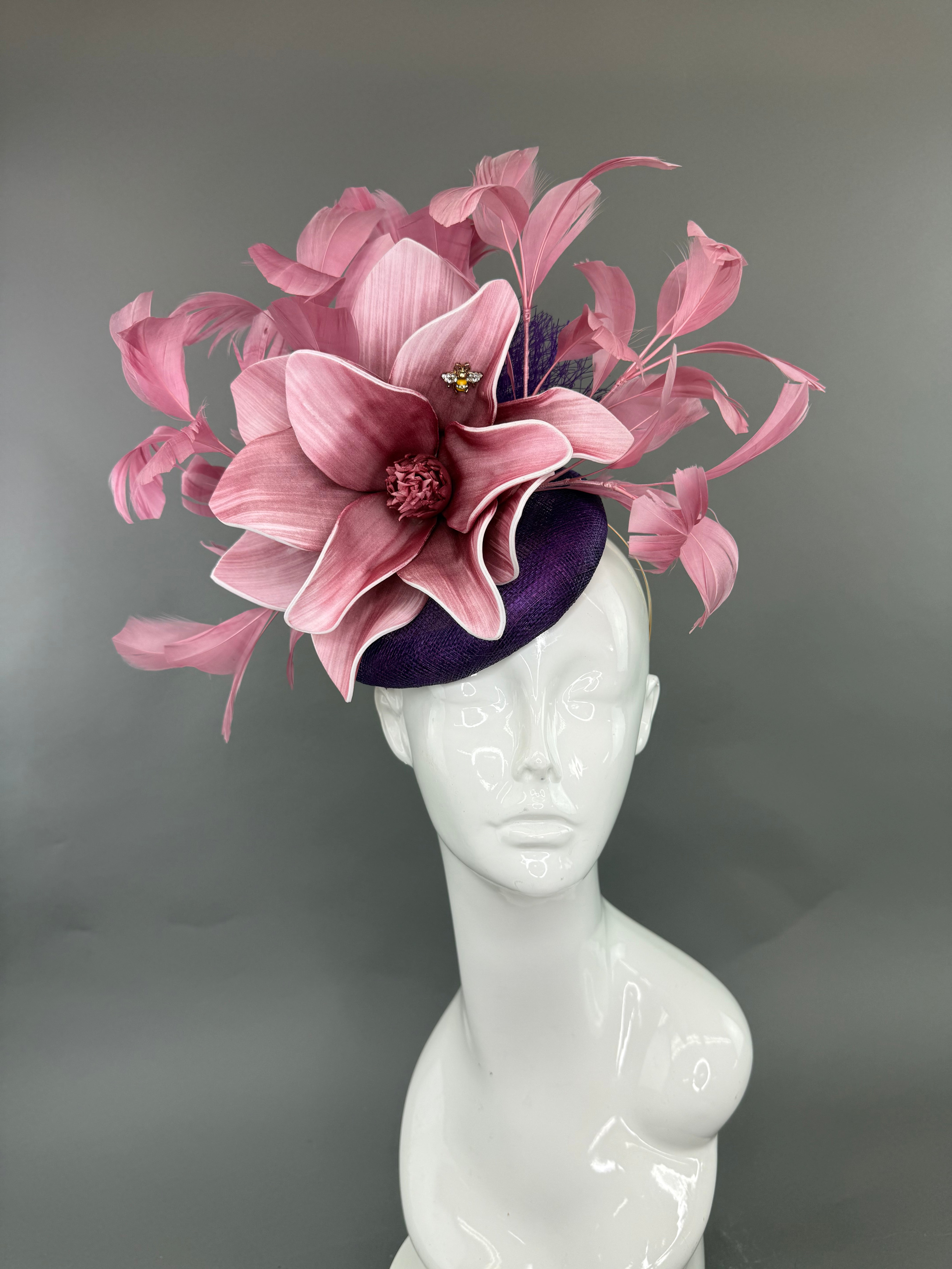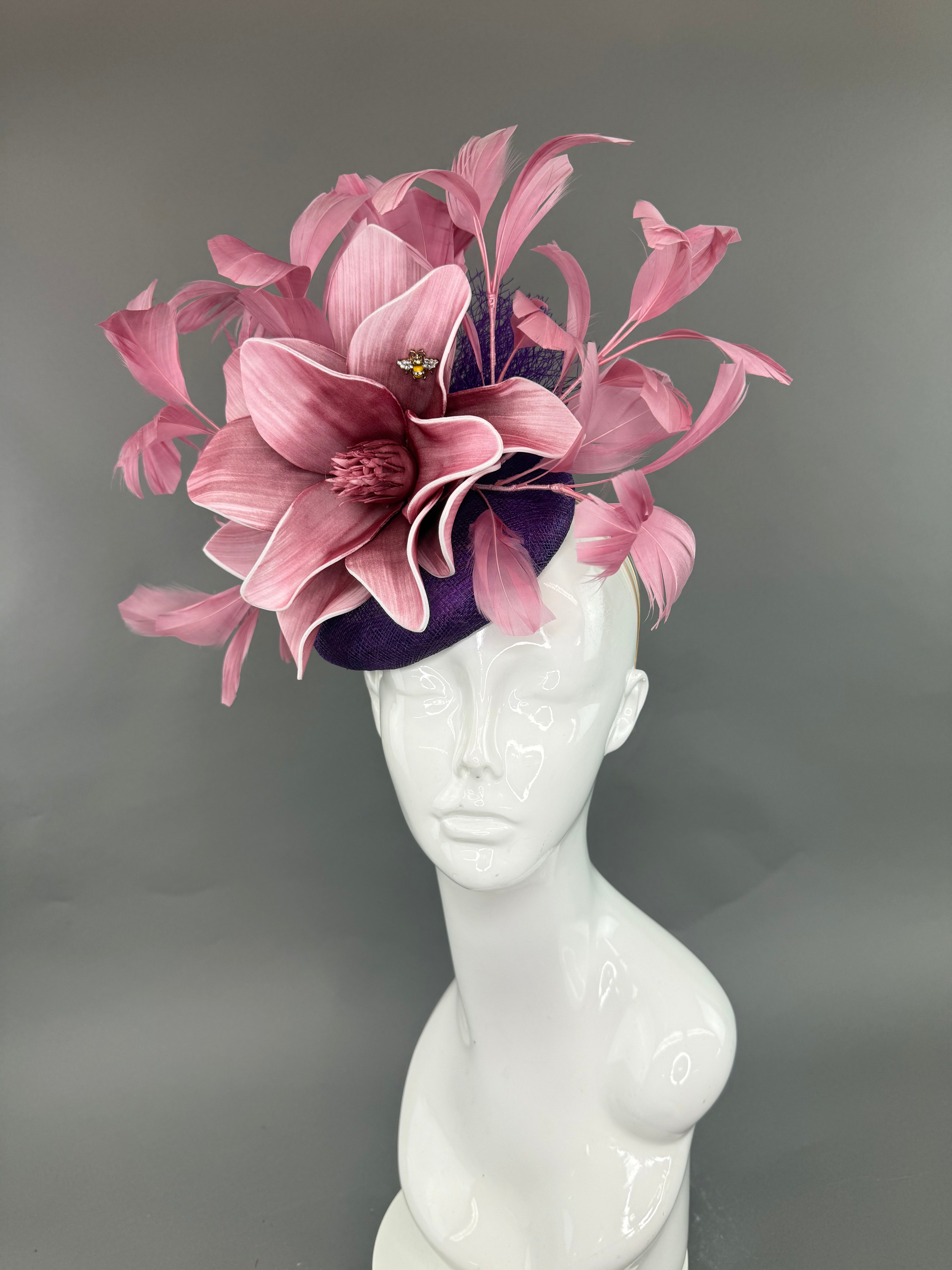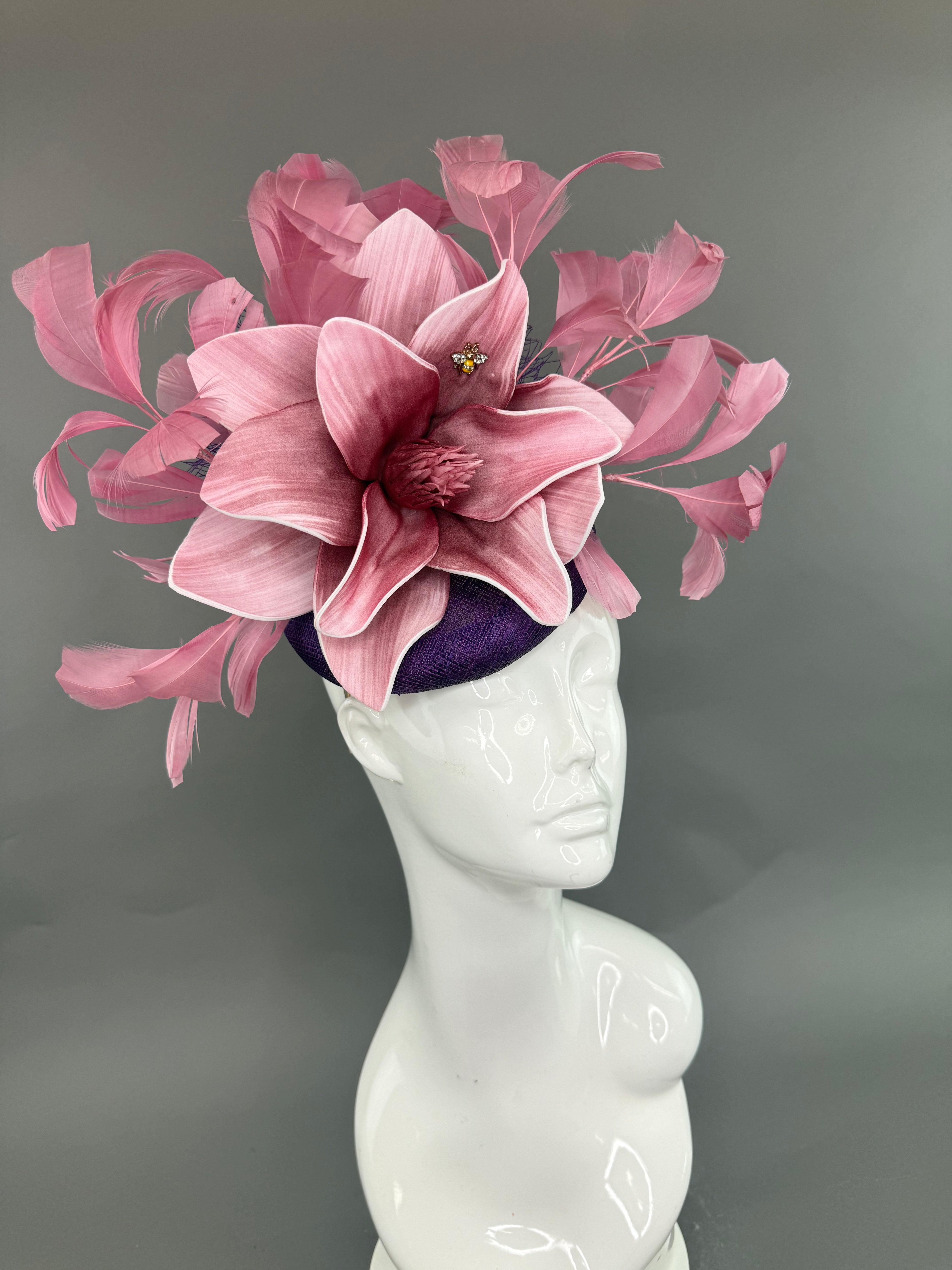 Purple sinamay fascinator base with blush pink feather sprays.  Attached is the jeweled bee, my signature mark on all of my custom and designer pieces