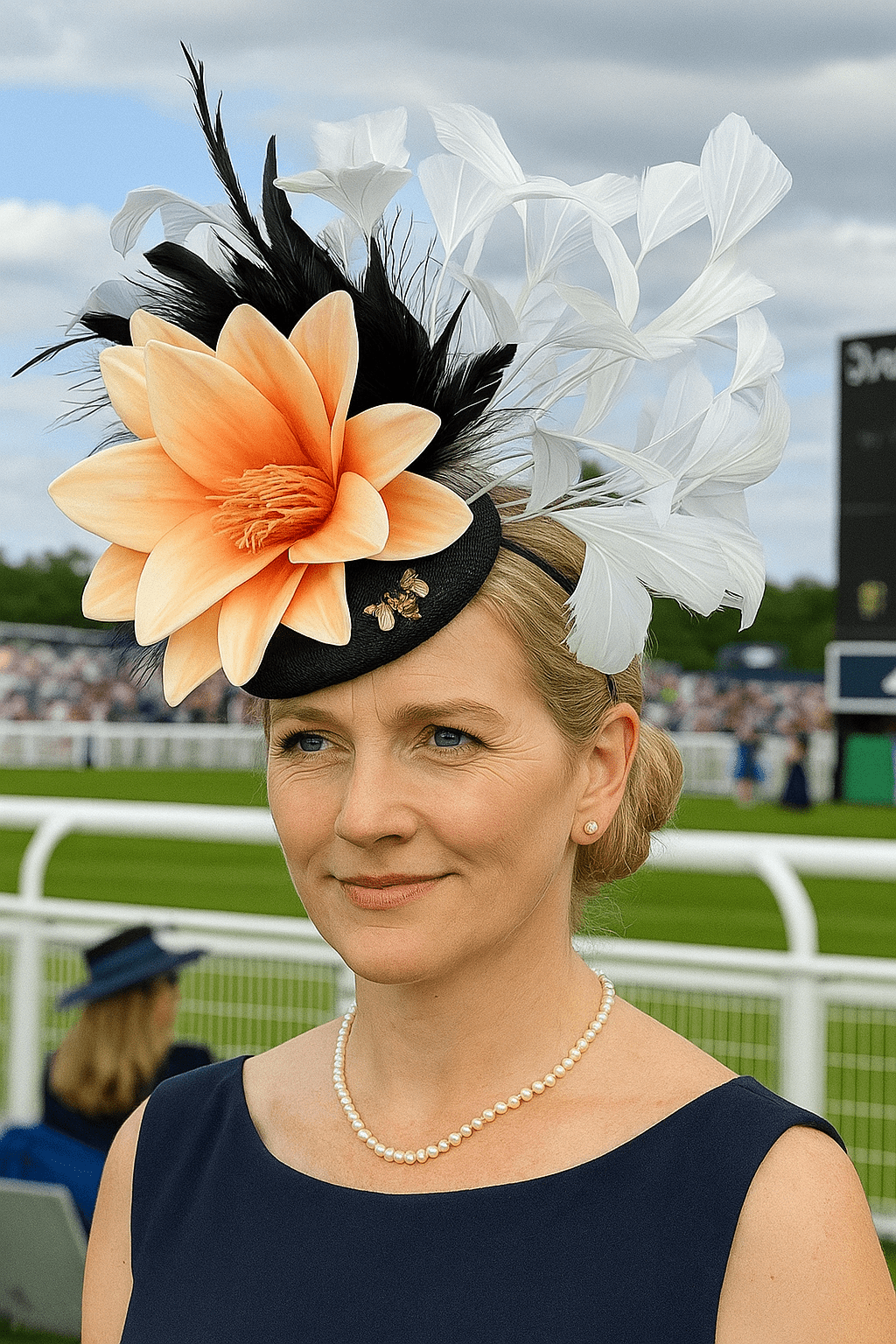 Black Fascinator with white feathers and peach floral bloom. Featuring the Jeweled Bee, my signature mark on all of my designer pieces.