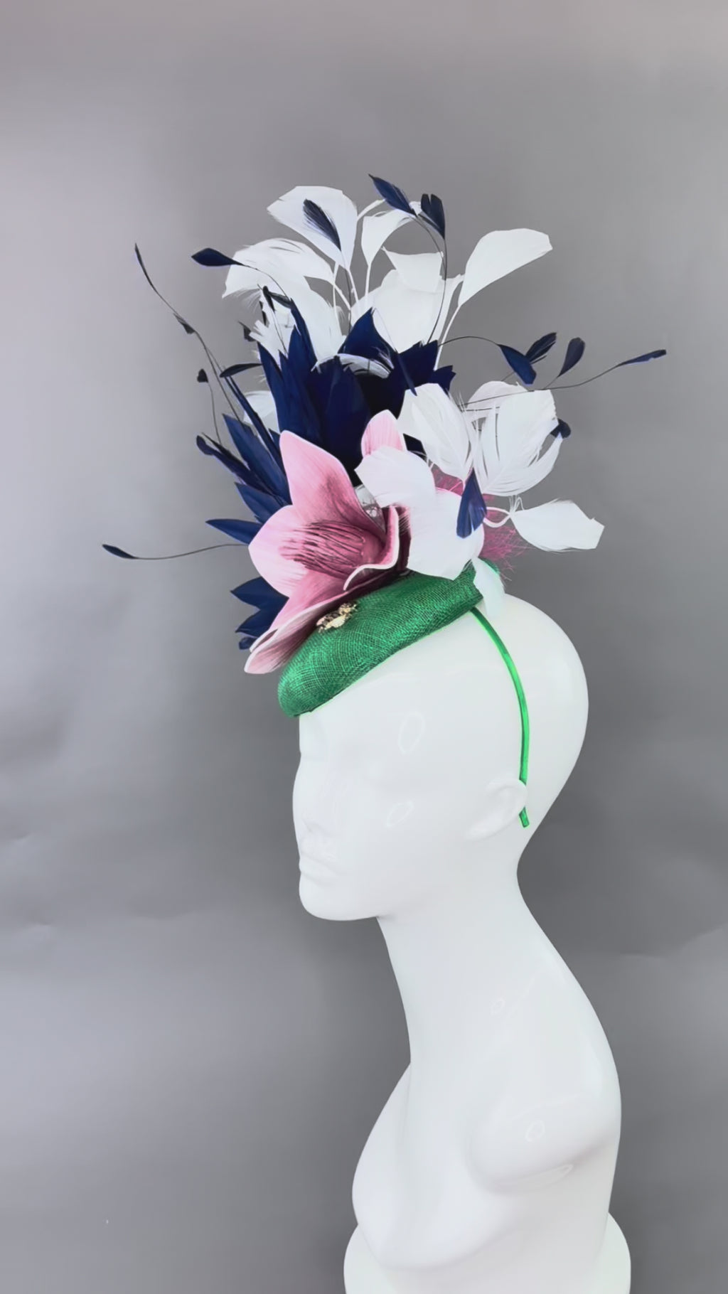 Green Fascinator with navy blue and white feathers and pink floral bloom. Featuring the Jeweled Bee, my signature mark on all of my designer pieces.