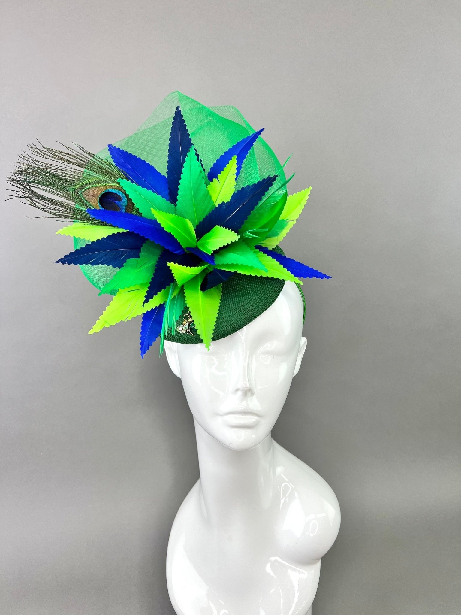 Emerald green, linen fascinator adorned with shades of navy and royal blue, lime and emerald green feathers.  Attaches with interchangeable headband or hair clip option.   Can be worn on the left or right side.  Light and comfortable to wear.  Prior to purchase, please note that all sales are final.  Don't forget to check us out on Instagram @TheHatHive.