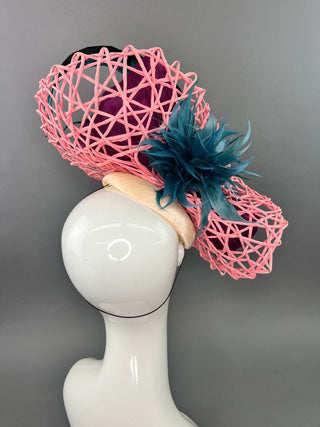 Pink mesh fascinator base adorned with deep magenta silk abaca fabric. Curled Lady Amherst feather and jeweled bee. My signature mark on all of my designer pieces. Attaches with elastic headband for comfortable and easy wear. One size fits all. Please note all sales are final.