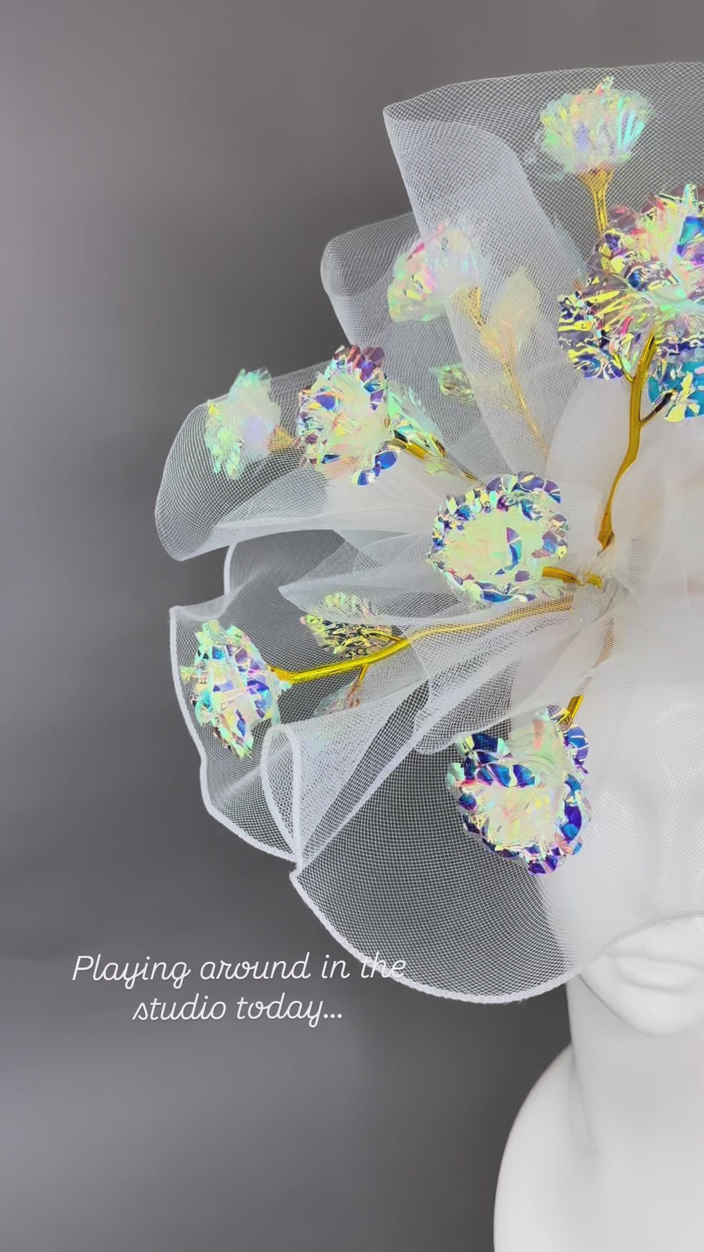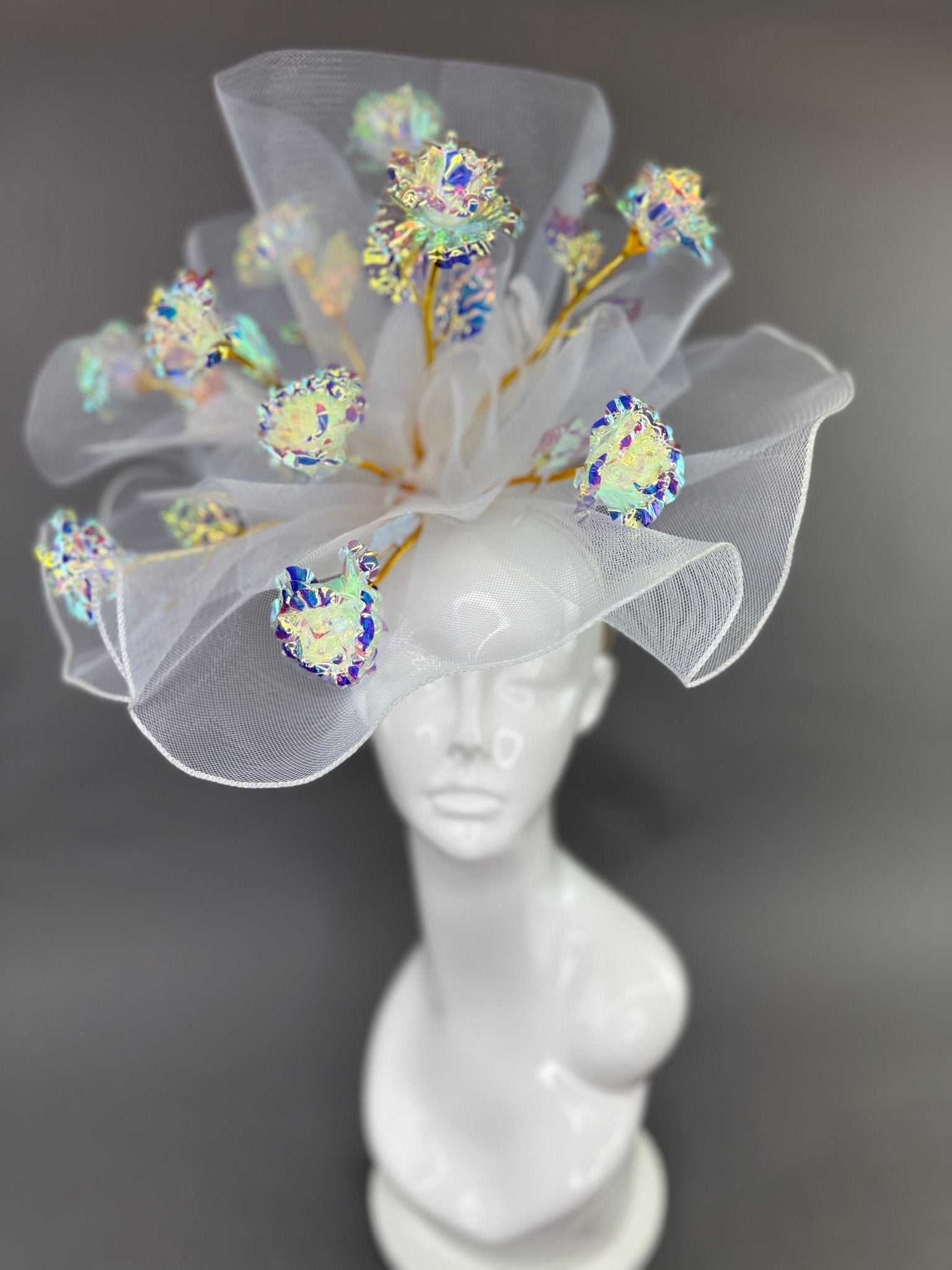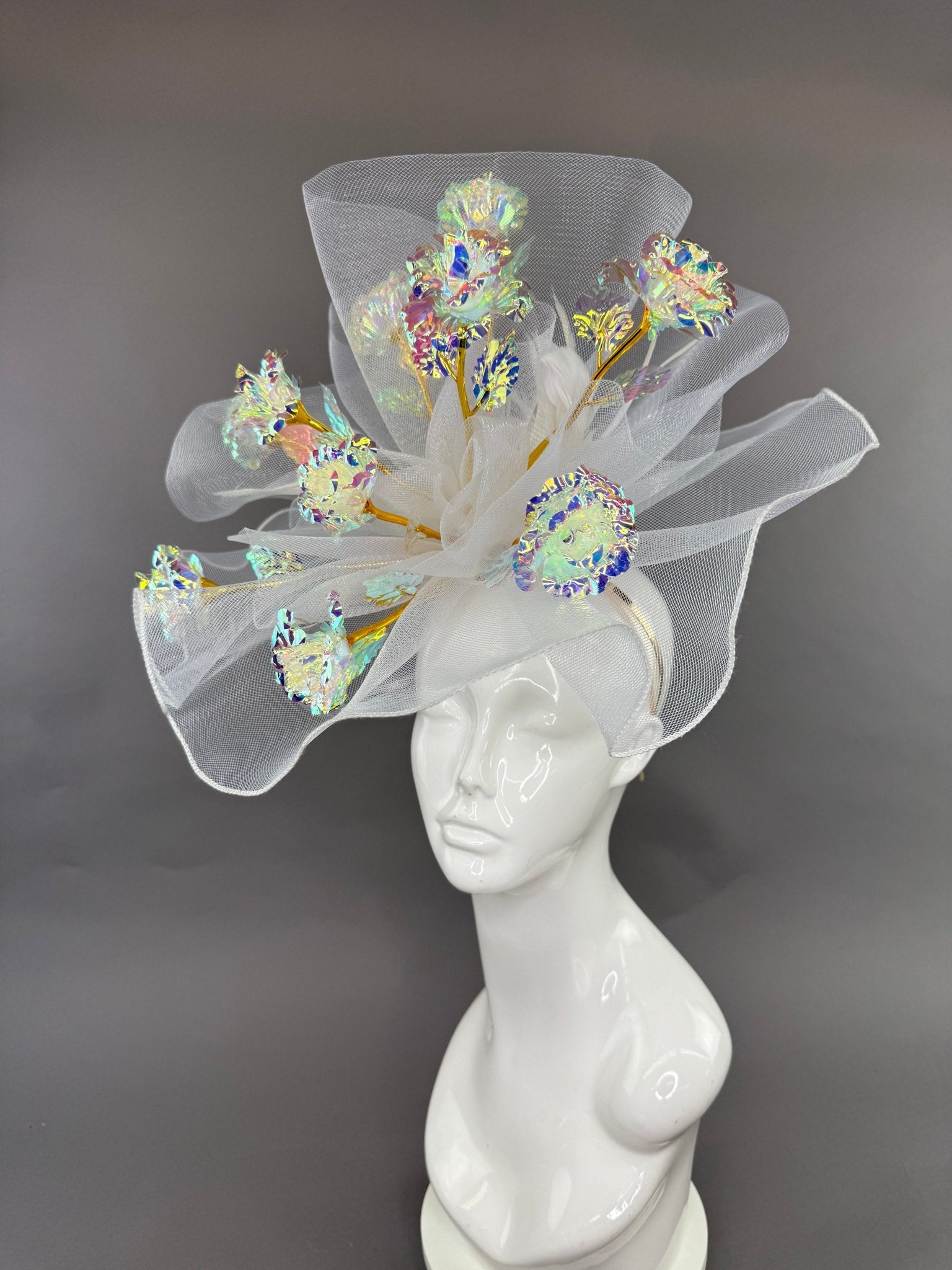 White crinoline hatinator adorned with gold stemmed iridescent roses attaches with an adjustable, metallic gold headband
