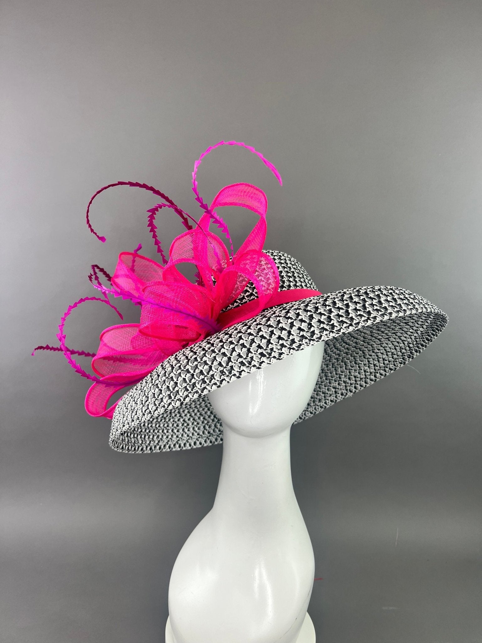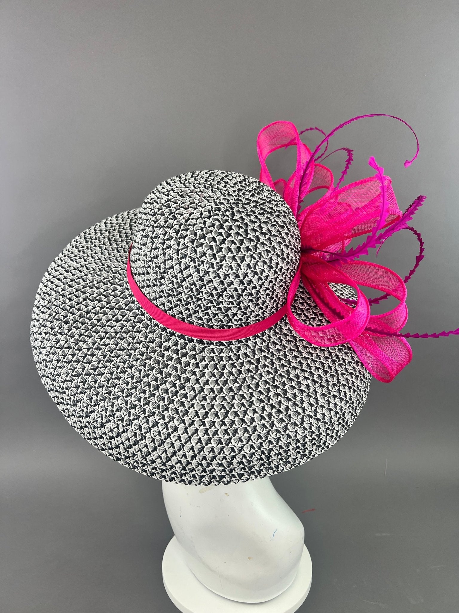 Black and white round brim hat with oversized fuchsia pink bow and fuchsia, jagged feathers. Adorned with the jeweled bee, my signature mark.