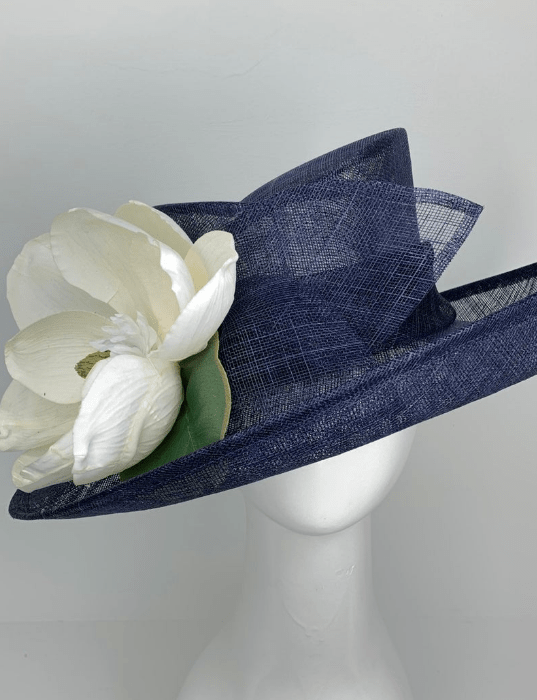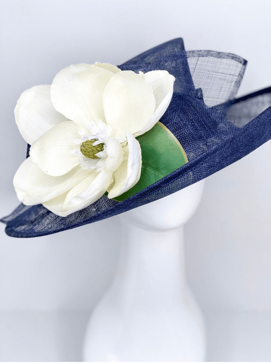 Navy Blue Hat adorned with Magnolia Flower Adorned with the jeweled bee and my signature mark on all of my designer pieces is perfect for the Kentucky Derby, Easter, Mother's Day Tea, High Tea, Wedding, or any special occasion.