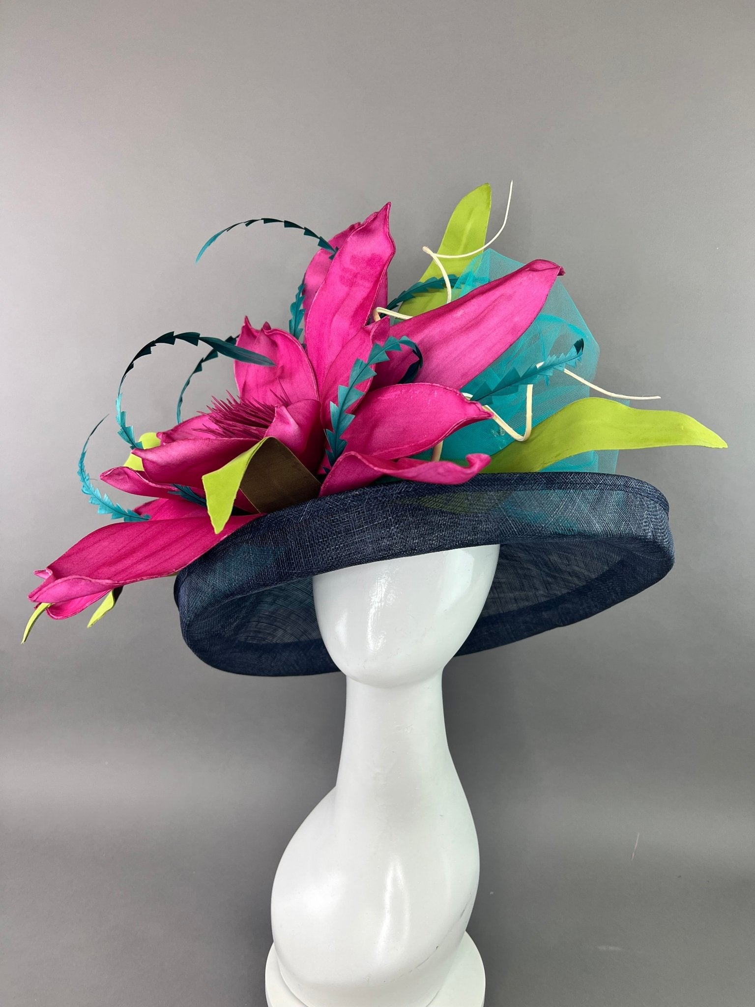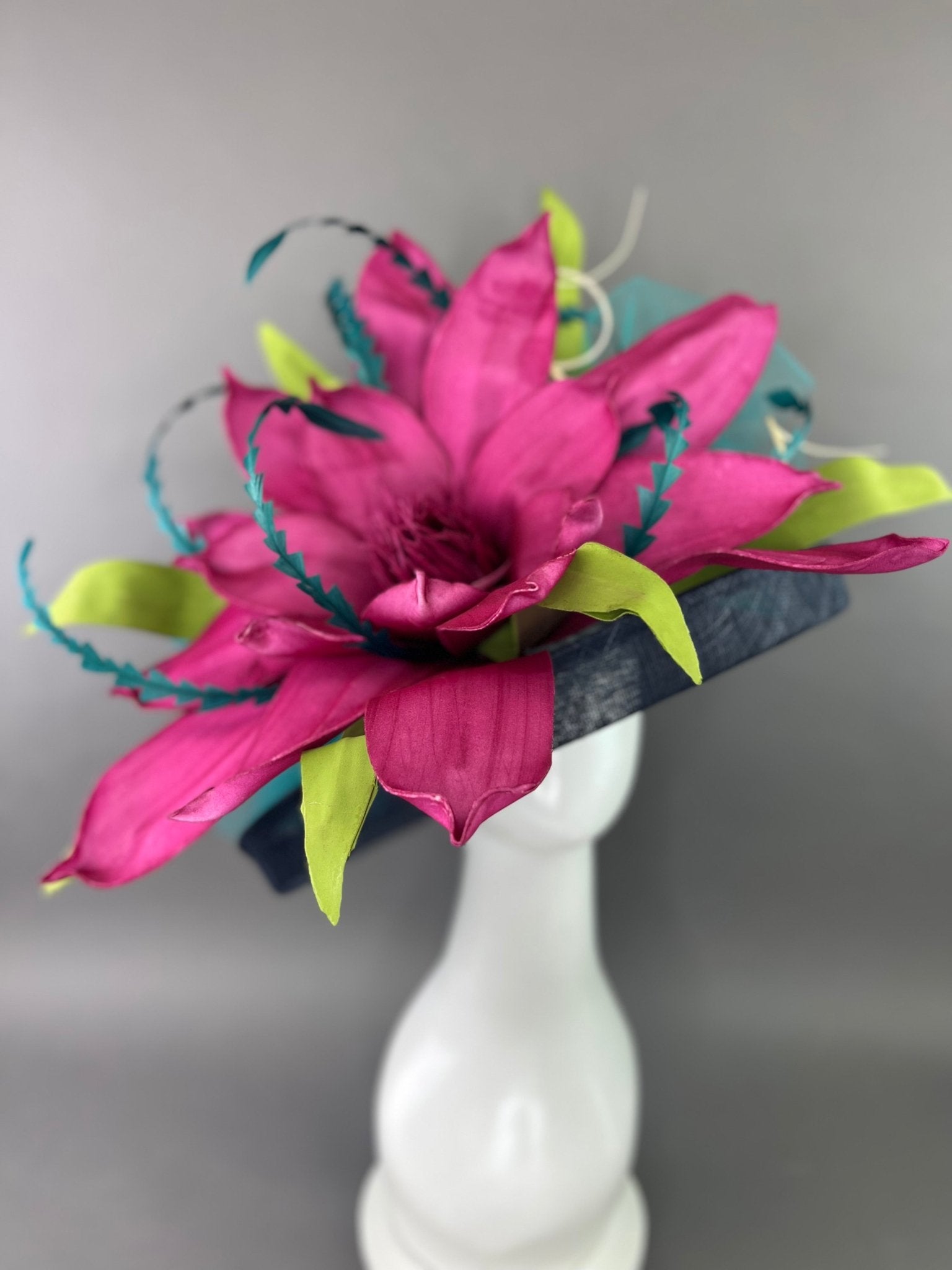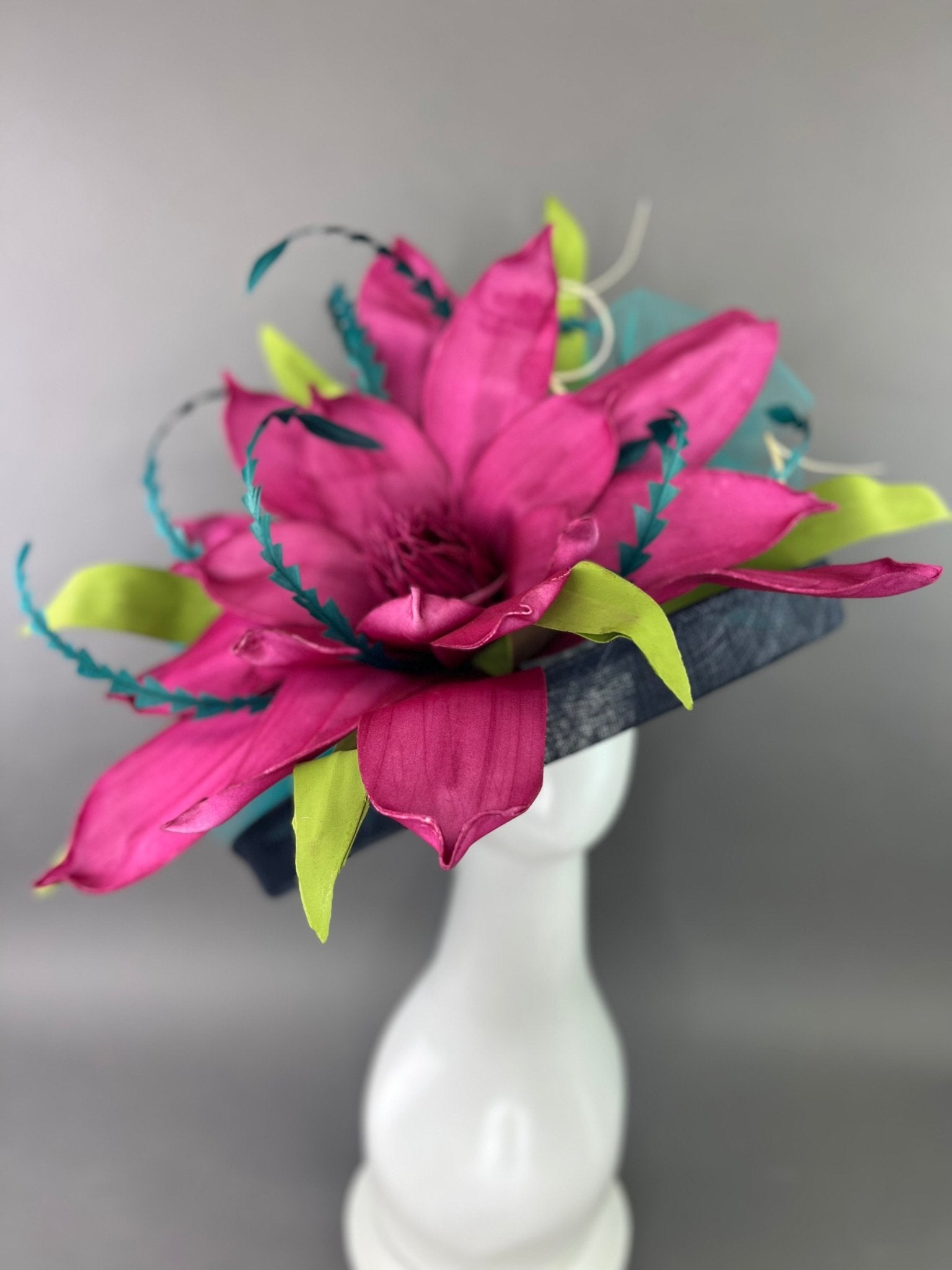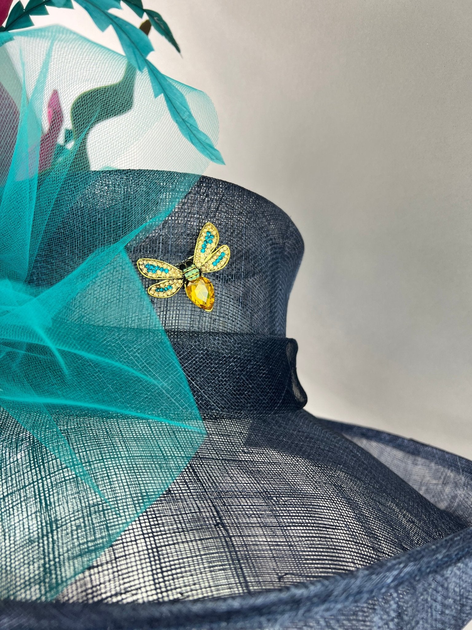 Navy blue, sinamay flipped brim hat. Adorned with an oversized magenta floral bloom with accents of teal, white and green. Attached is the Jeweled Bee.  My signature mark on all of my couture pieces.