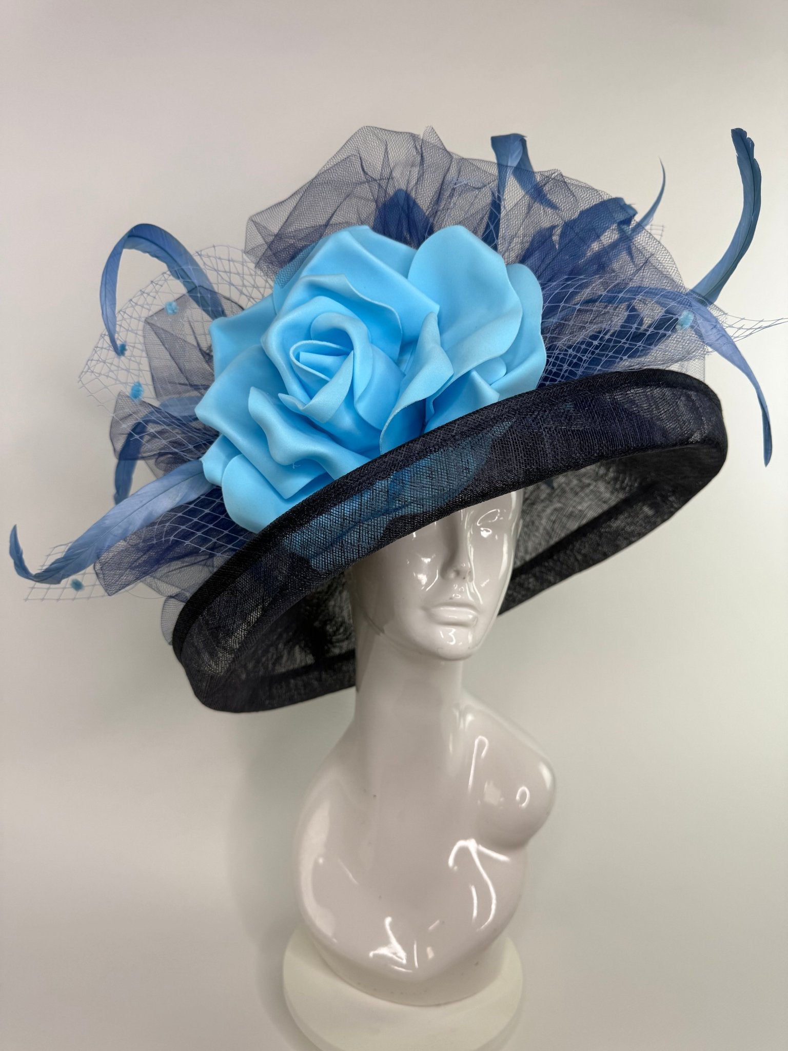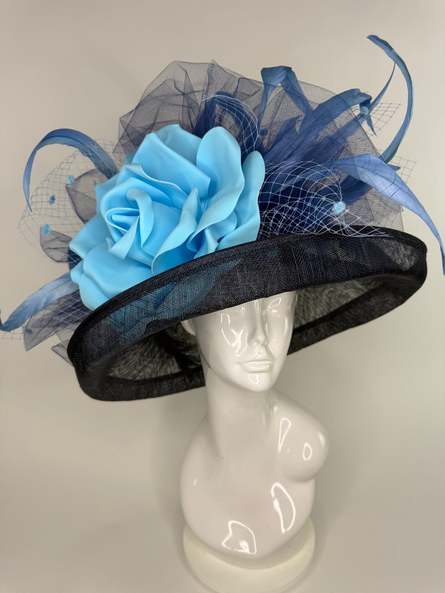 NAVY BLUE FLIPPED BRIM WITH BABY BLUE ROSE KENTUCKY DERBY HAT