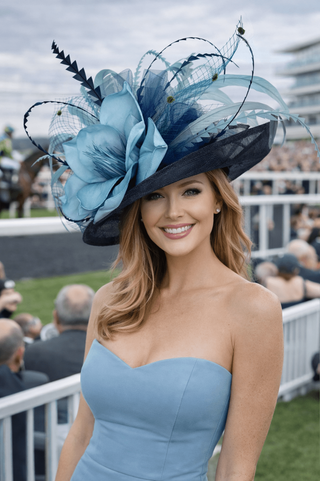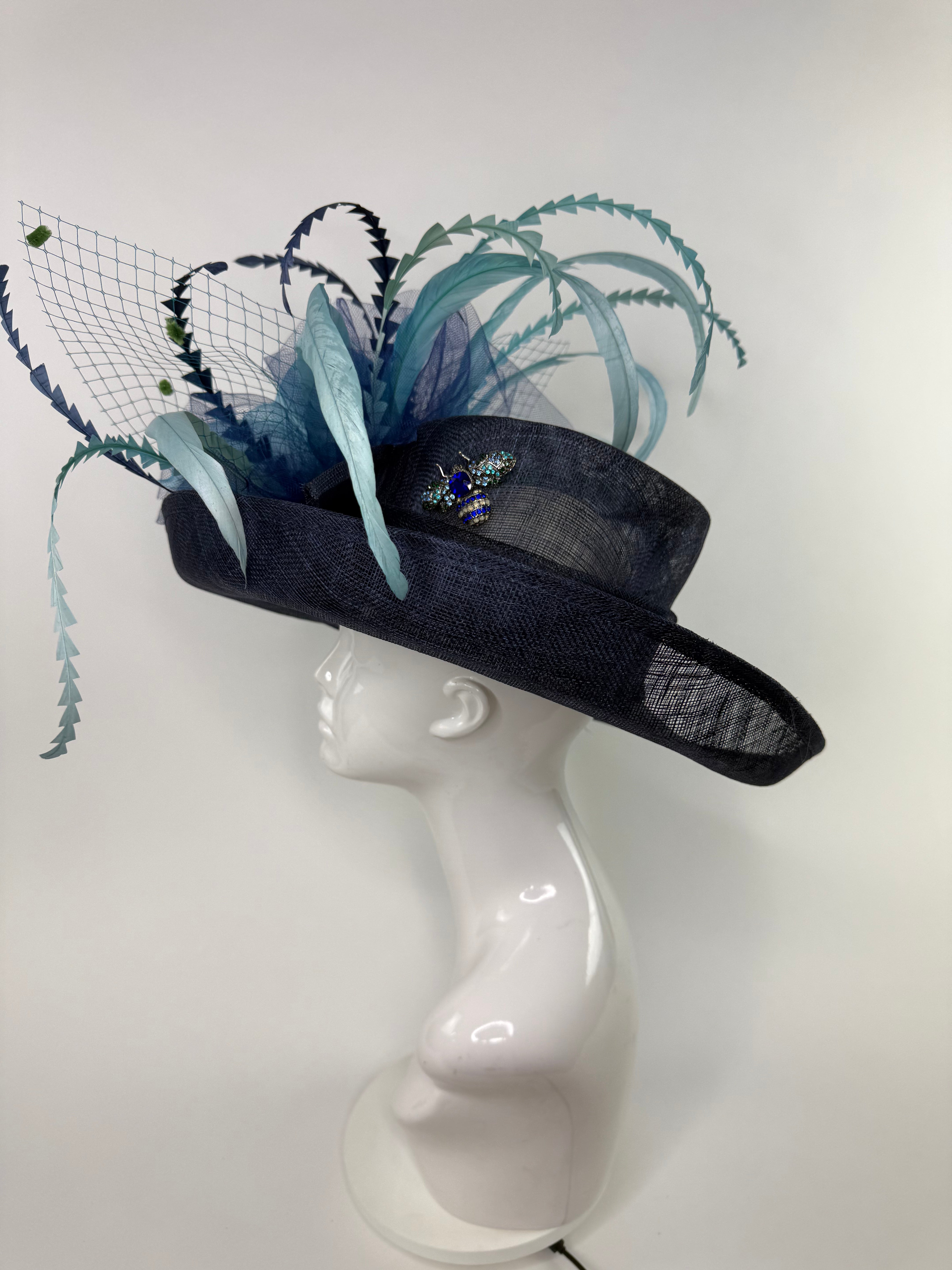 Navy blue flipped brim sinamay hat adorned with an oversized dark turquoise floral bloom, netting and feathers. Attached is the jeweled bee, my signature mark on all of my designer pieces.