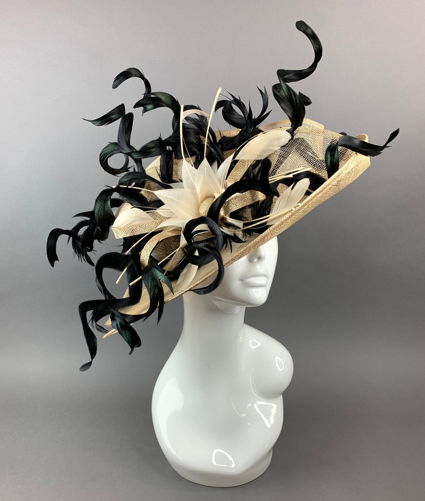 Nude flipped brim sinamay hat adorned with curled black feathers.