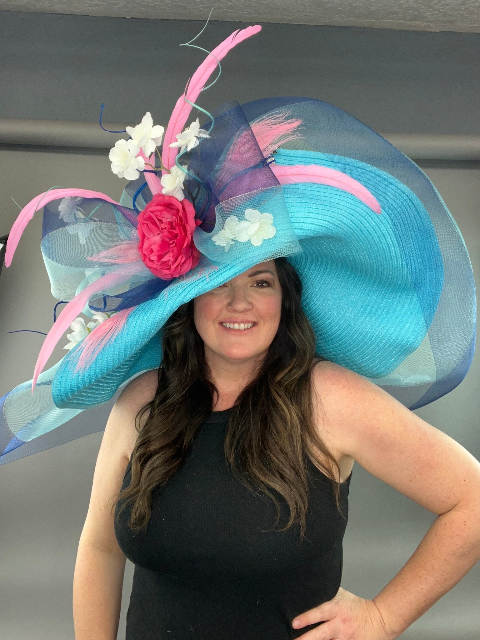This oversized turquoise floppy is adorned with royal blue and pink accents. Designed to make a statement while still comfortable to wear. Adorned with the jeweled bee, my signature mark!  Hat measures 22.5” crown measurement. Please measure prior to purchasing as all sales are final.