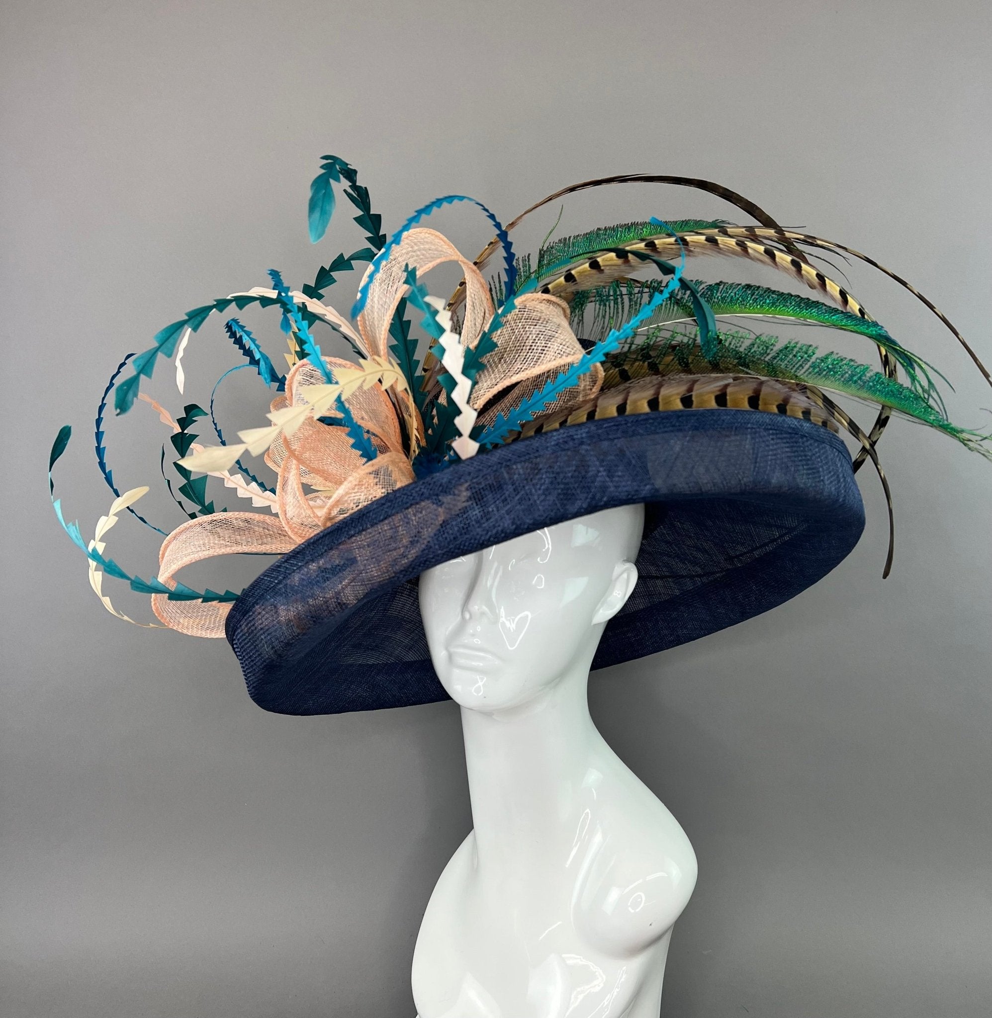Navy Blue flipped brim hat adorned with peacock spines.  Coordinated with shades of teal and turquoise feathers.