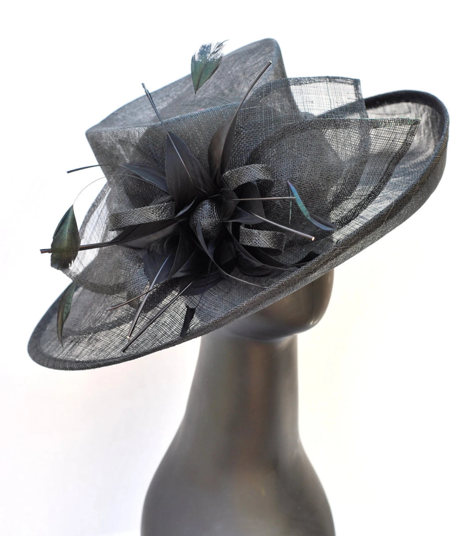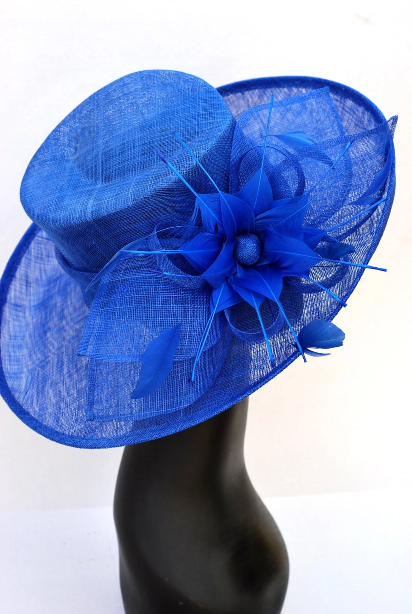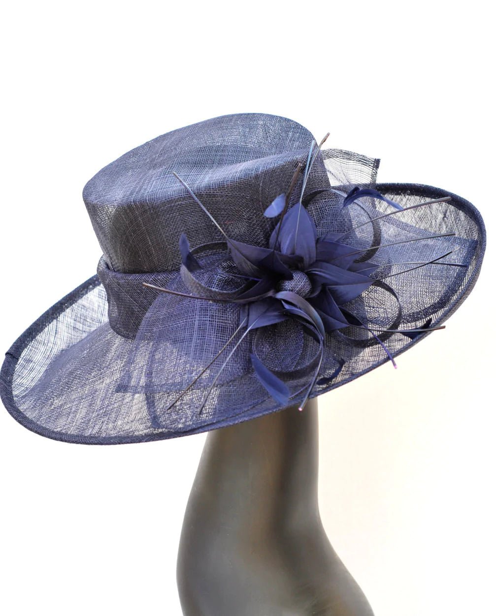 Sinamay flipped brim hat adorned with sinamay petals and feather bloom.
