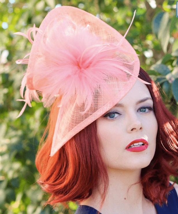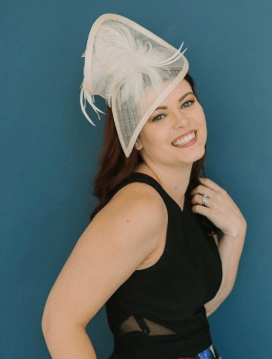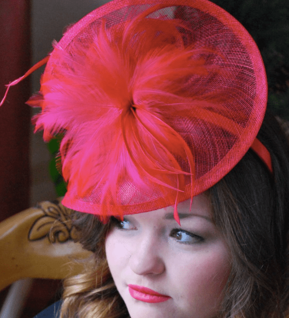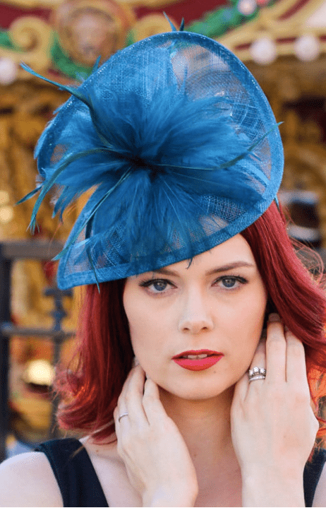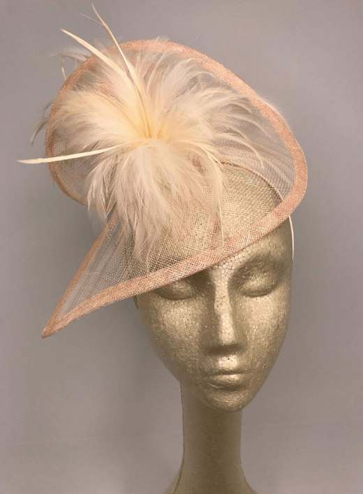 “THE TAYLOR” Sinamay Fascinator with feathers. This piece is one size fits all & made to wear on the right side of your head. It’s ultra light & attaches with a standard headband for light, ease and comfortable wear.