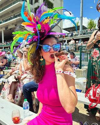 All designer fascinators include the jeweled bee, Kristie’s signature mark.
