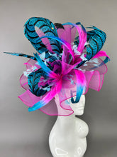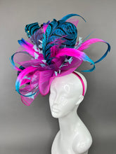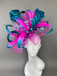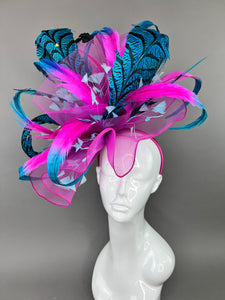 Fuchsia crinoline fascinator adorned with teal Lady Amherst feathers, fuchsia and turquoise ombre feathers with pops of light turquoise feathers.