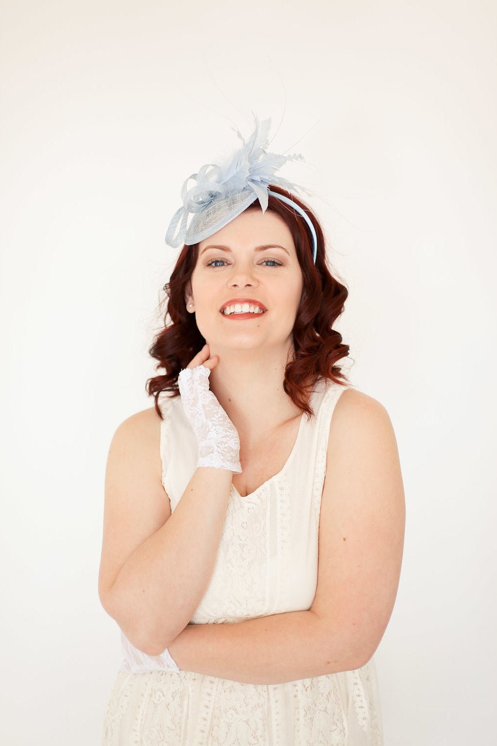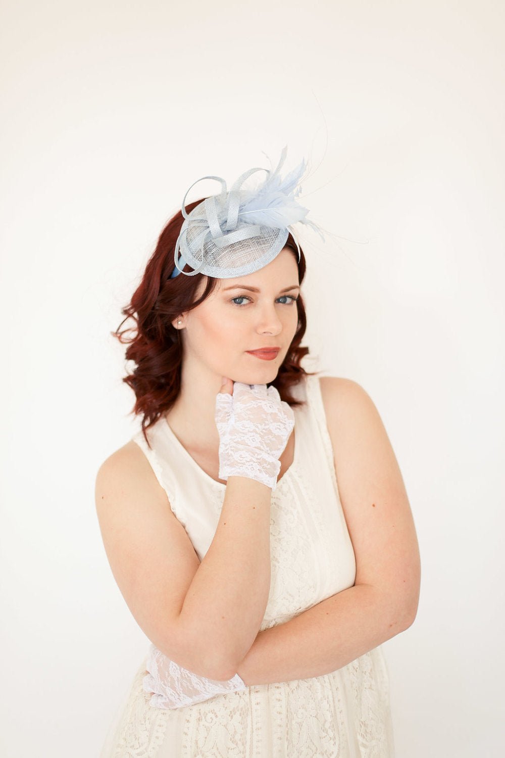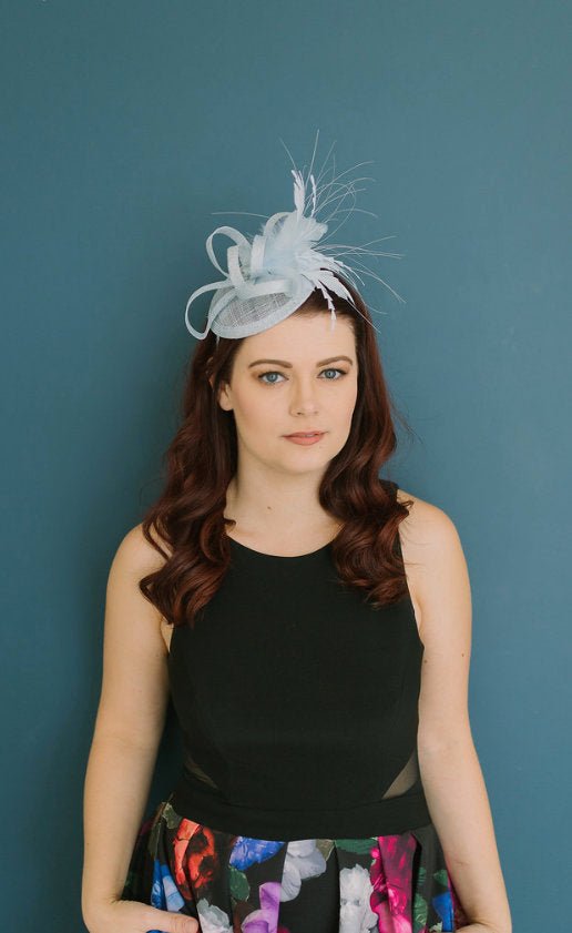 light blue Sinamay Fascinator with feathers and satin headband is perfect for the Kentucky Derby, Easter, Mother's Day Tea, High Tea, Wedding, or any special occasion. 🐝