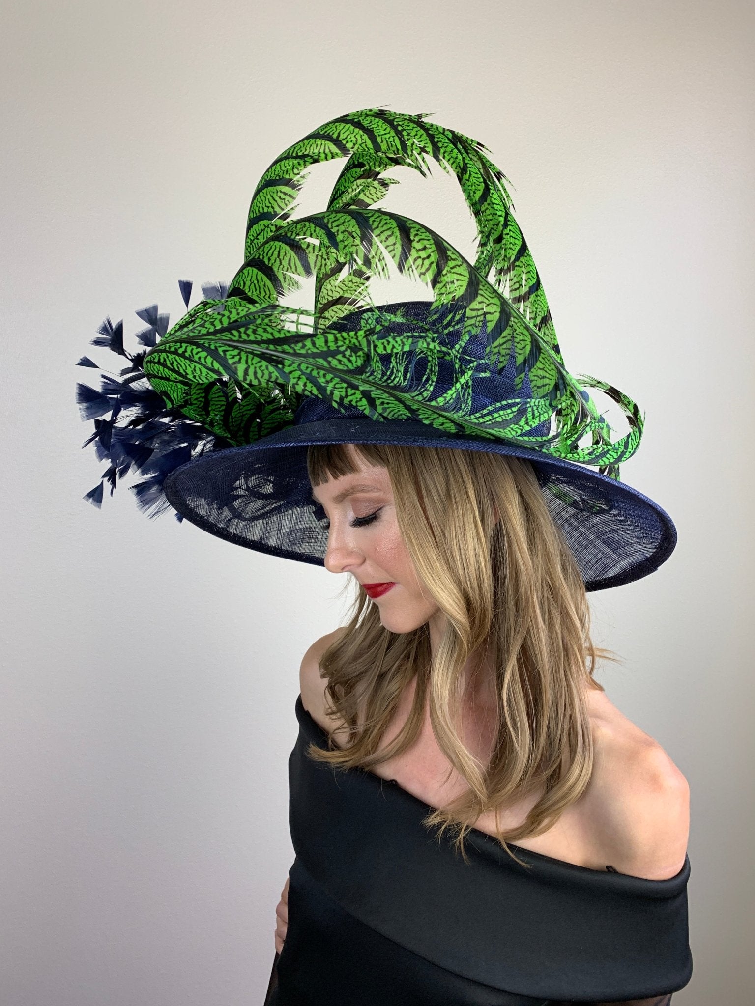 This beauty is an eye catcher! Round, sinamay navy hat adorned with sinamay looping decor and lime green Lady Amherst feathers. This piece is adjustable with an internal elastic to fit crown size 22.5" and smaller.