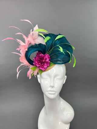 Teal green silk abaca fascinator with hints of lime green and pink. Attaches with a headband for comfortable wear.