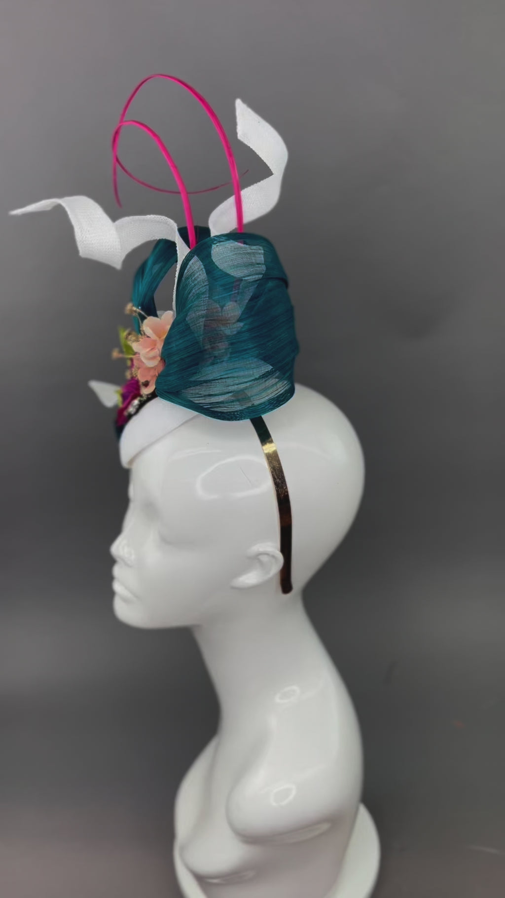 A show-stopping white fascinator handcrafted with rich teal green silk abaca ribbon, layered with lush deep magenta and soft blush floral blooms. Subtle pops of metallic gold add a luxe shimmer, making this headpiece perfect for weddings, spring races, or any unforgettable entrance.