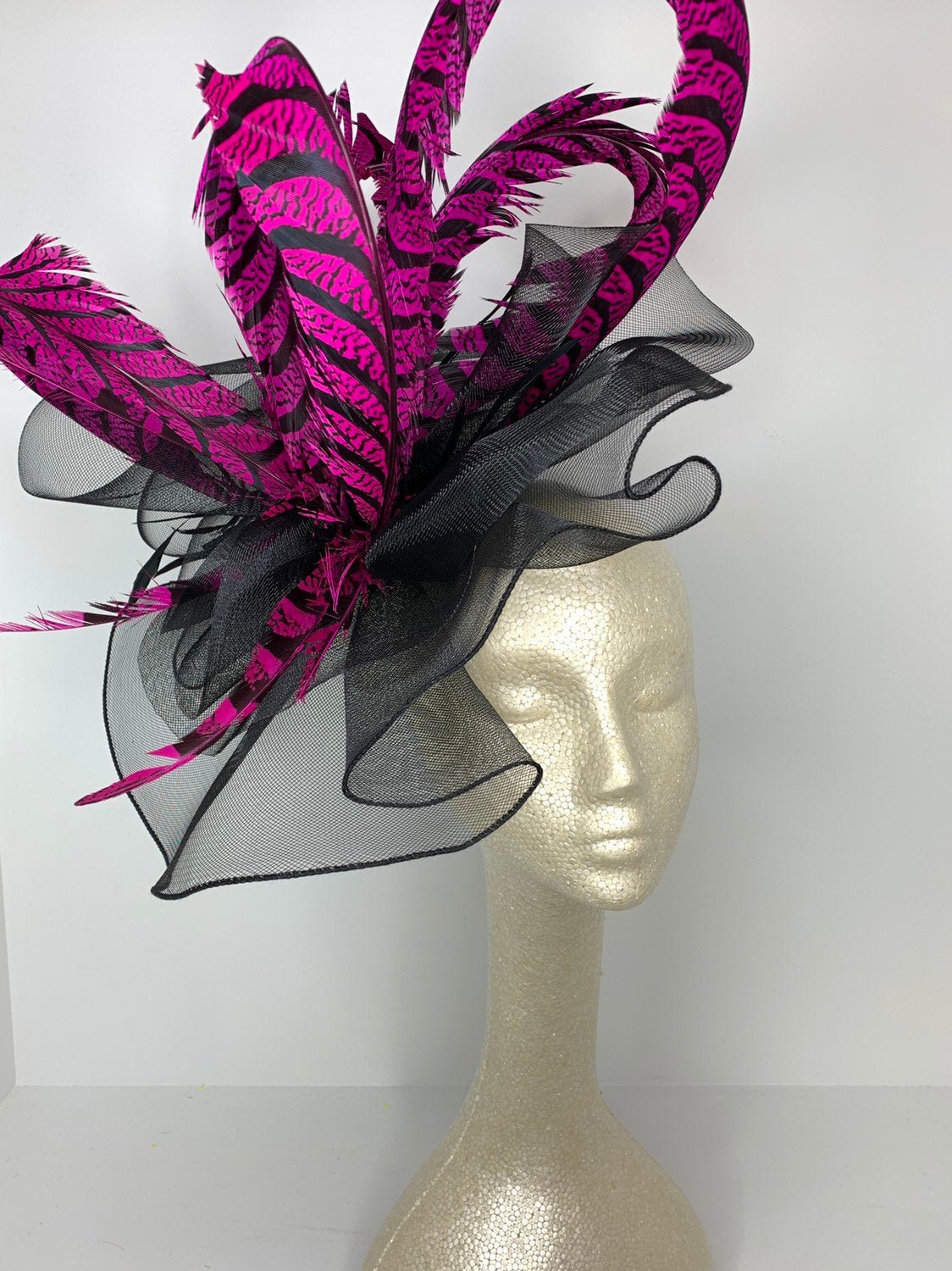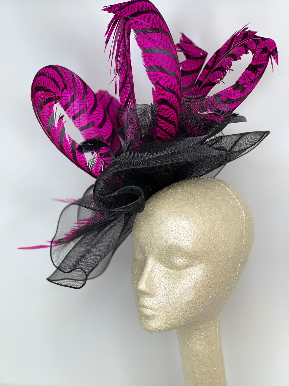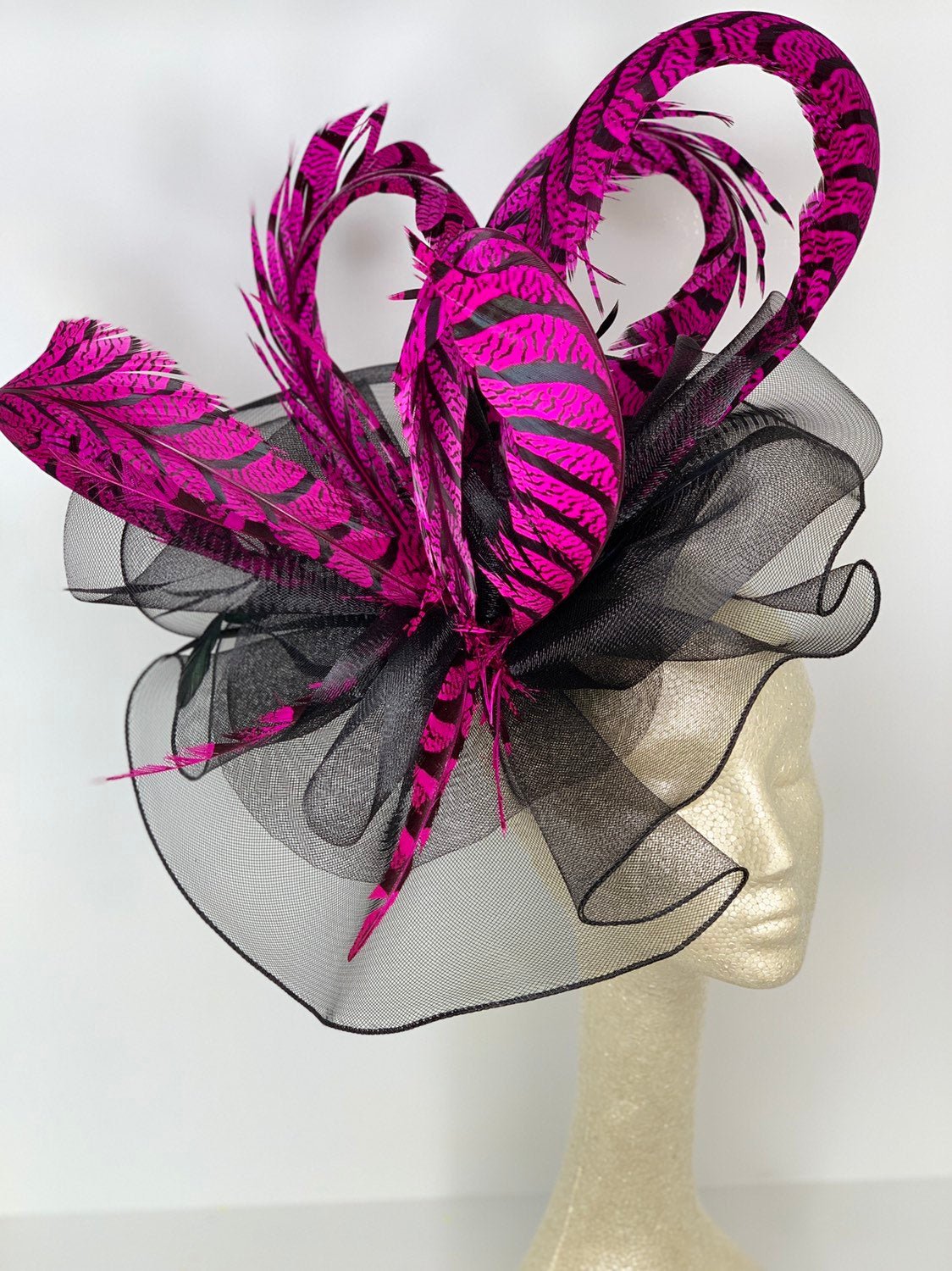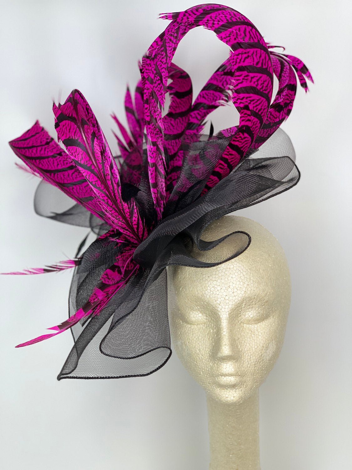 *Black mesh base adorned with five, gorgeous fuchsia Lady Amherst feathers.